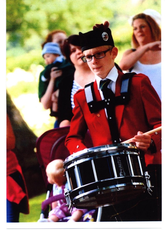 | June 2012. Armed Forces Day - Henley-in-Arden Left to Right: Andy Walker, John McGee (hidden), Alan Kitchen, Alan Pollock, Allan Baxter, Peter Cound, Andy King, Simon Hayward, Thomas Weithaler (standing at front), Dave Mellor, Tom Taverner (Leading Drummer), Keith Murphy (Drum Major), Phillip Taverner, Luke Donaldson, Carl Gray, Alice Murphy, Jonathan Prior, Mike Hope, Malcolm Chant, John Cadman (Pipe Major) 495Kb - Photo by Sue Hope | |