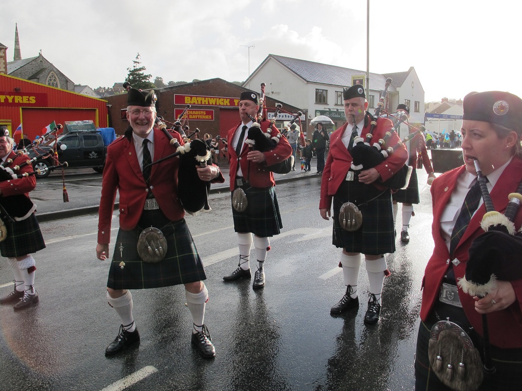| March 2013. St Patrick's Day Parade - Birmingham Welcome Back Paula! John Cadman (Pipe Major), Peter Cound (behind), Jonathan Prior, Simon Curtis, Paula Wilson (who has been ill for the past year), Keith Murphy (Drum Major0, Allan Baxter, Jimmy Hunter, Andy King 438Kb | |