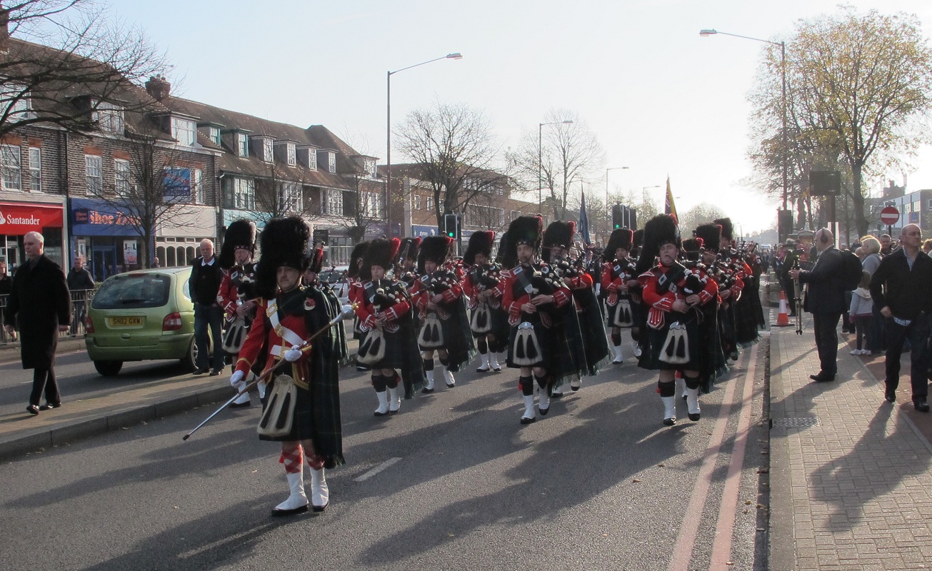 | November 2013. Remembrance Day Parade, Shirley John Cadman (Pipe Major), Jimmy Hunter, Mike Hope, Keith Murphy (Drum Major), Carl Gray, Rebecca Giles, Peter Cound, Dave Mellor, John McGee, Andy Walker 135Kb - Photo by Jenny Mellor | |