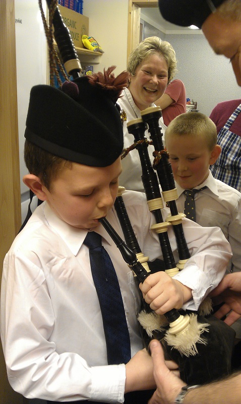 | January 2012. Burns Night - Burtle, Somerset Future recruit?: John McGee helps a young waiter to play his first note. 152Kb | ||