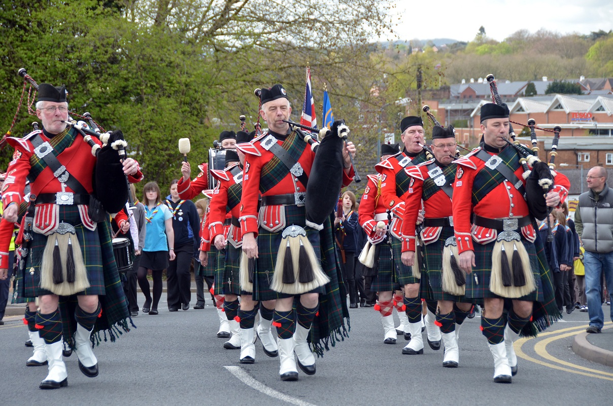 | April 2013. St George's Day Parade - Kidderminster Craig Donaldson, Alan Kitchen, Tom Taverner (obscured), Andy King, Simon Harrison (obscured), John Cadman (Pipe Major), Jimmy Hunter (obscured), Luke Donaldson 324Kb - Photo by Bryan Harris | |