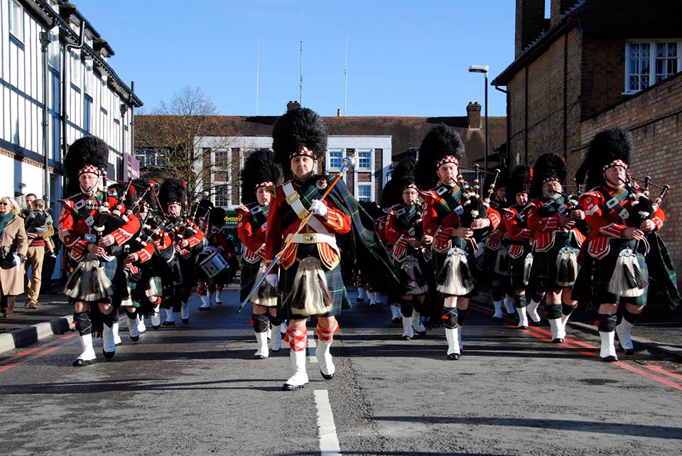 | January 2013. Burns Night - Burtle, Somerset Leading out the haggis: John Cadman (Pipe Major) leading, followed by Heather Lee (Chef) and Allan Baxter 397Kb - Photo provided by the Polden Post | |