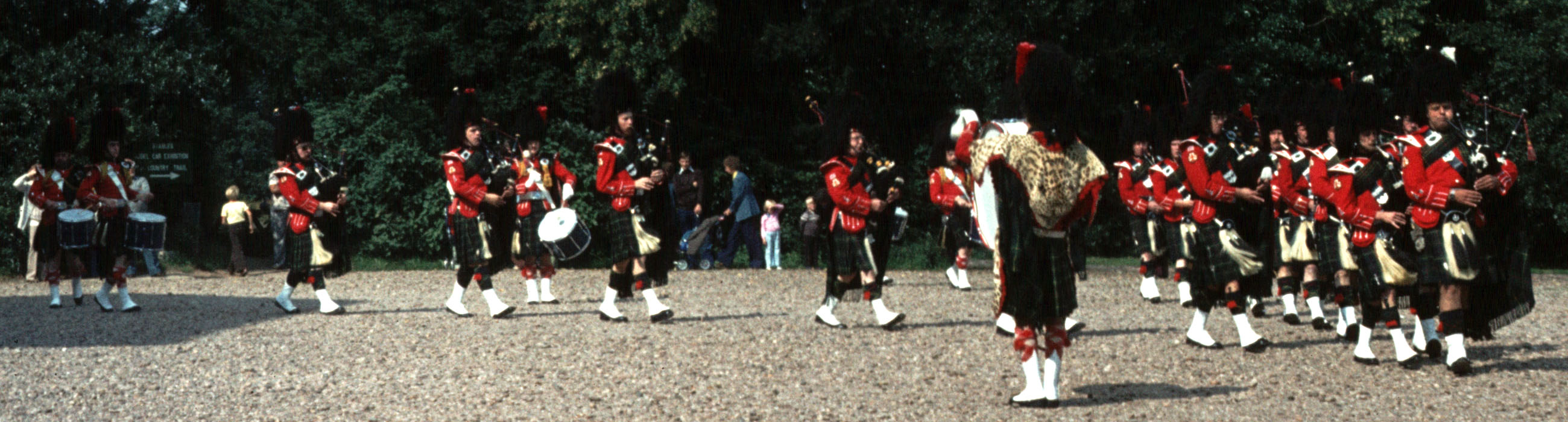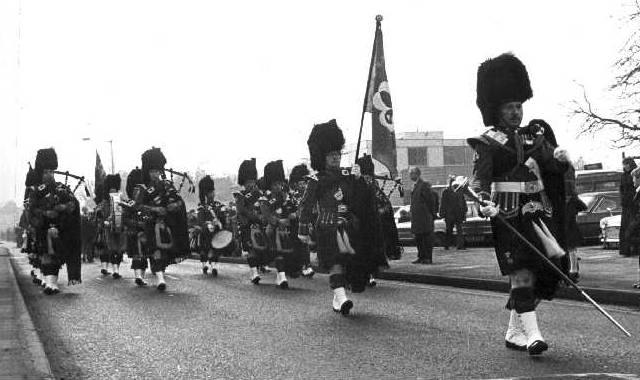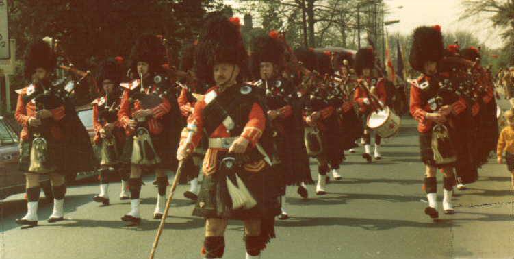 | November 1979. Armistice Day Parade, Shirley, Solihull Pipe Major's file: Chris Hughes (turning to signal end of tune), Pete Taylor, John Maybury, ?, Andy Hill Next file: John Dalman, John Henderson Dick, Mike Hope Next file: Rick Stewart, Mike Hope, Robin Lackey, Ron Whelan, Dave Nelson, Martin Hope Next file: Richard Court, Dave Mellor, Chris Jervis 104Kb