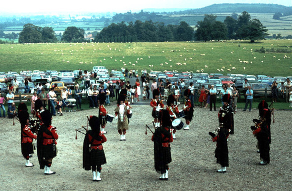 | August 1980 Ragley Hall Figure of Eight (crossover) Pipe Sergeant's File (from front): Richard Court, Dave Mellor, Mike Hope, Neville Cross, Ron Wheelan, Martin Hope, Andy Cross Pipe Major's File (from front): Chris Hughes, Martin Hewins, John Dick / Hederson, Pat Martin, Pete Taylor, John Fear, ? Bass (back to camera): Steve Catch, Tenor (far side): Jim Galeford 146Kb