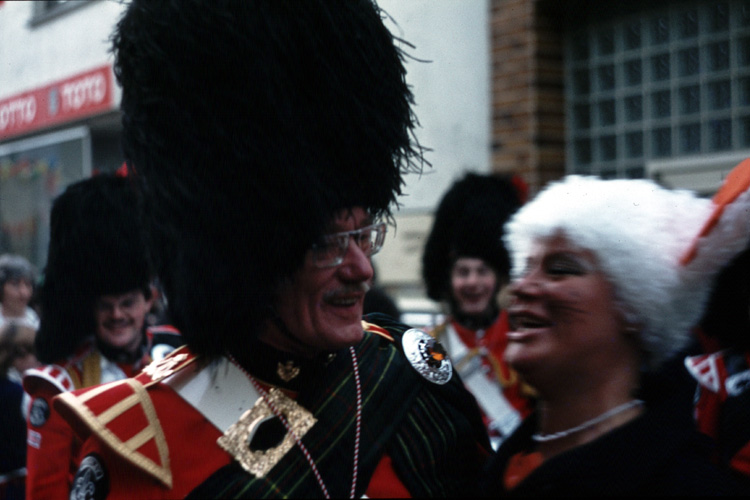 | March 1981 Mainz, Germany During parade in Mainz: Mary Stewart (dancer), Martin Hope (side drummer), Colin Poole (bass drummer) 55Kb