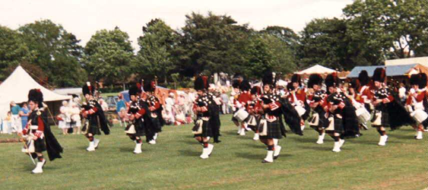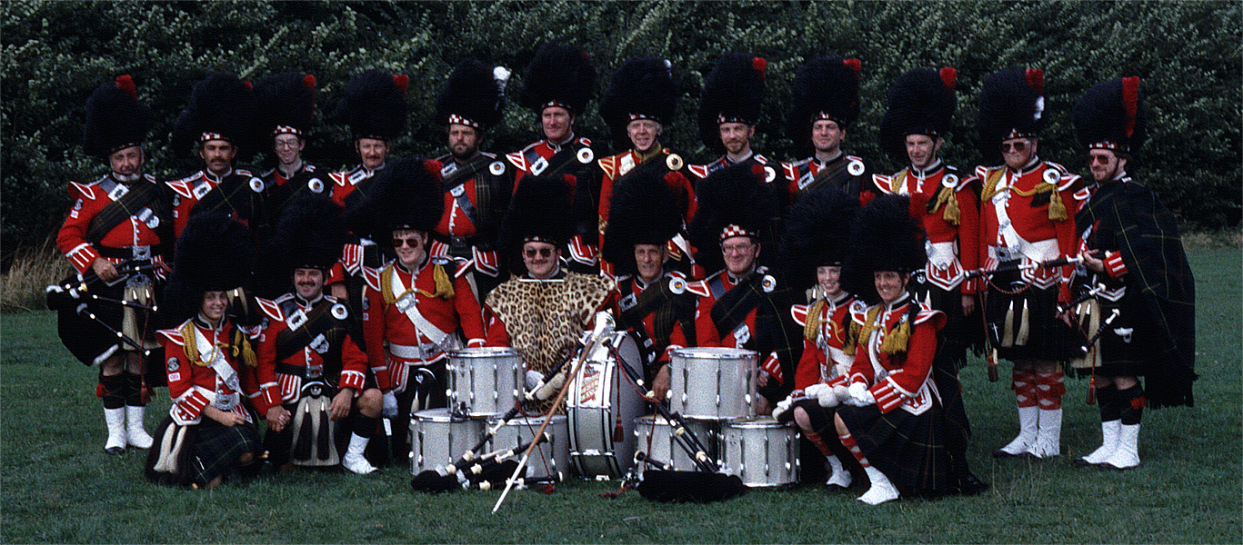 | August 1989. Fete, Tiddington, Stratford-upon-Avon Standing: Pete Taylor, Keith MacKenzie, Gary Mellor, John Henderson Dick, Chris Hughes (Pipe Major), Allan Baxter, Stewart Hunter (Drum Major), Dave Mellor, Kevin Minton, Andy Hill, Jon Hughes (Leading Drummer), Mike Hope Kneeling: Emma Carter, Jimmy Hunter, Paul Webb, Jim Galeford (Bass), Denis Carter, Albert Hope, Joanne Mellor, Pauline Carter 297Kb